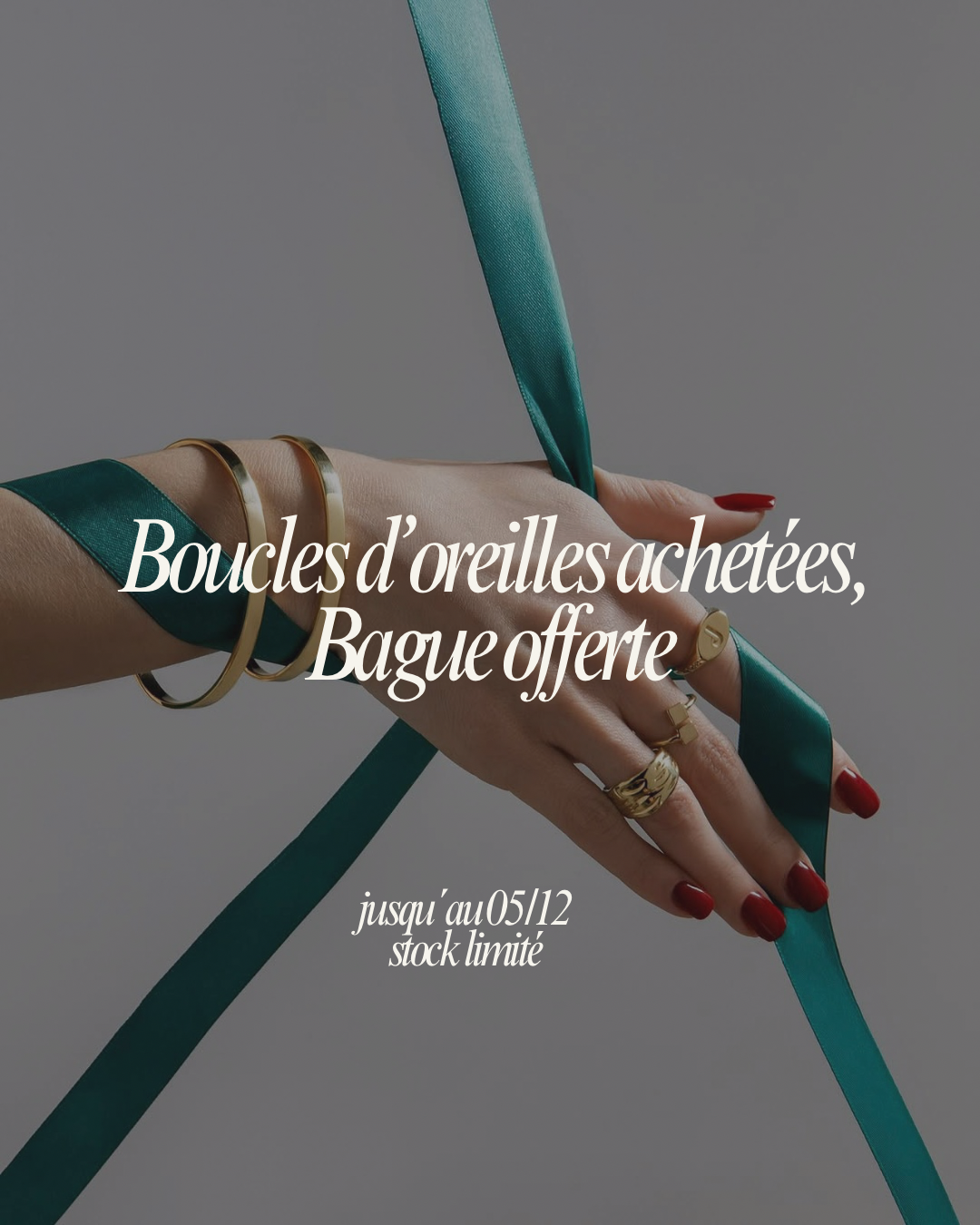 Une bague offerte pour toute commande contenant au moins une paire de boucles d’oreilles. ajoutez la bague de votre choix dans votre panier